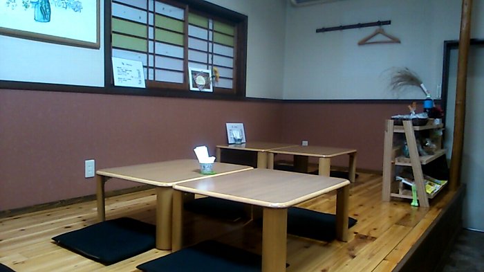 8席くらいのカウンターと板の間にテーブルがあります。