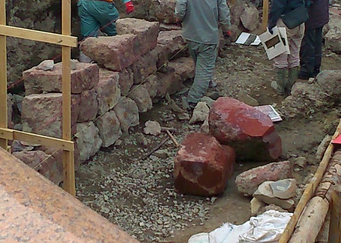 端の方には、当時使われていたと思われる、赤い石が積まれています。